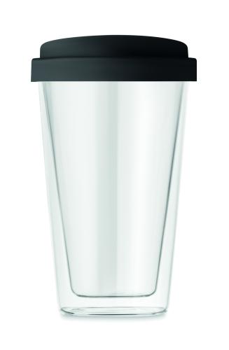 Double wall high borosilicate glass with silicone lid. Capacity 350ml