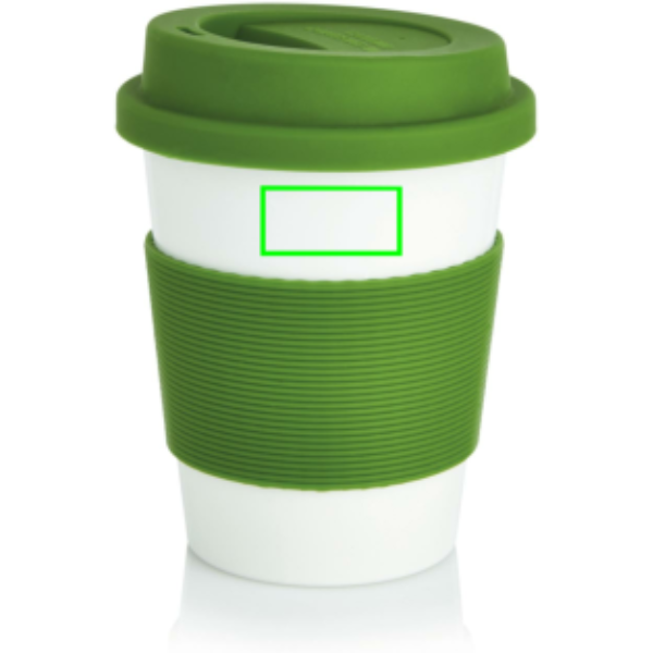 350ml tumbler with silicone grip and lid. Manufactured from 100% plant material (PLA). BPA free and dishwasher proof.