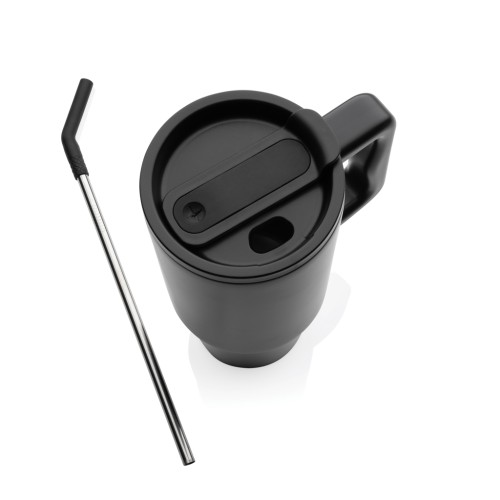 Experience the spacious yet conveniently portable embrace of our generously sized tumbler – not too big, not too small. Its comfort-grip handle and slim base make it a perfect fit for most cup holders, ensuring you stay refreshed whether you're enduring a long day of meetings, conquering a rowing class, or embarking on a trip out of town. Crafted from durable recycled stainless steel, this 900 ml. tumbler rises to the hydration challenge. This double-walled, vacuum-insulated tumbler comes complete with a spill secure lid, recycled steel straw, and a silicone straw tip. The screw-on lid boasts a dual function, offering a convenient drinking spout or the option to use a straw. We recommend handwash. RCS certification ensures a completely certified supply chain of the recycled materials. Total recycled content: 70% based on total item weight. BPA free.