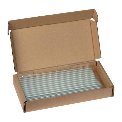 Reusable and tempered glass drinking straw with 20 cm length. This item comes in a box with 50 pieces including a cleaning brush. Dishwasher safe.