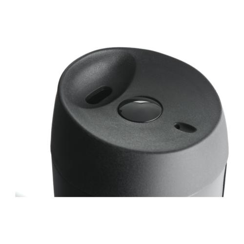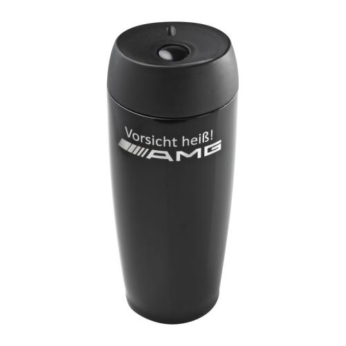 Double-walled elegant insulated drinking mug, which can be opened and closed by a push button on the lid. The mug has a capacity of 400 ml and is made of high-quality stainless steel inside and outside.