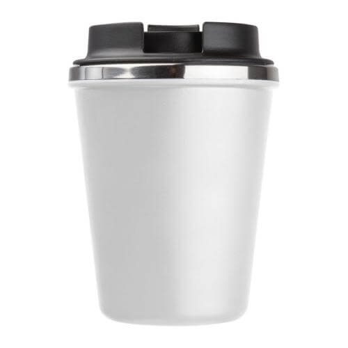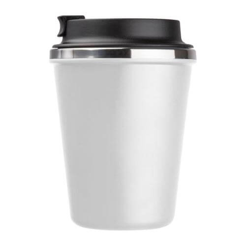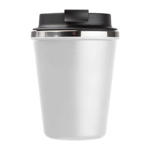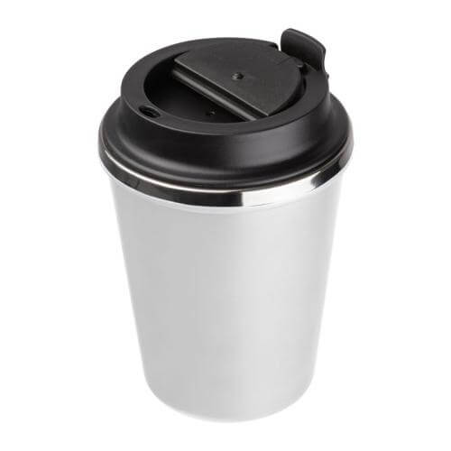Double-walled drinking cup with a stainless steel interior and a recycled plastic exterior. Filling capacity of 350ml and a leak-proof screw cap with lockable drinking opening.