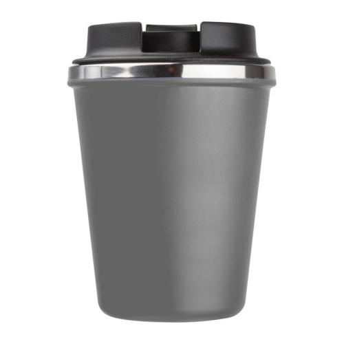 Double-walled drinking cup with a stainless steel interior and a recycled plastic exterior. Filling capacity of 350ml and a leak-proof screw cap with lockable drinking opening.