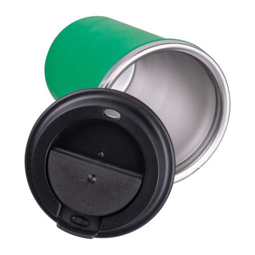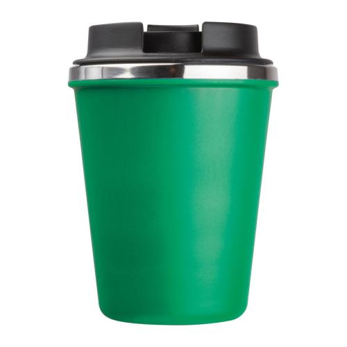 Double-walled drinking cup with a stainless steel interior and a recycled plastic exterior. Filling capacity of 350ml and a leak-proof screw cap with lockable drinking opening.