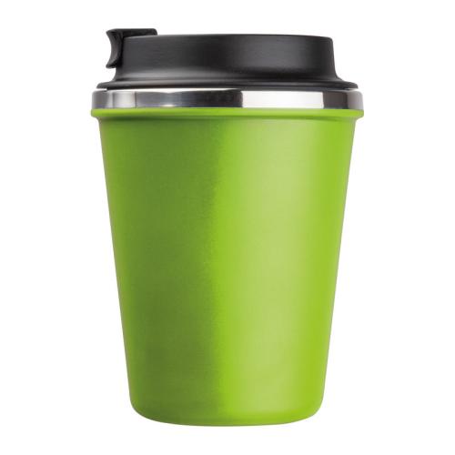 Double-walled drinking cup with a stainless steel interior and a recycled plastic exterior. Filling capacity of 350ml and a leak-proof screw cap with lockable drinking opening.