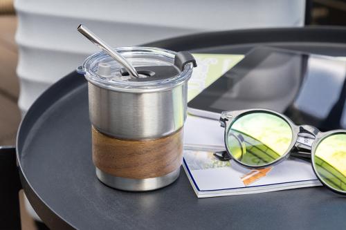 Single-wall, recycled stainless steel travel cup with walnut wood grip, plastic drinking lid and recycled stainless steel straw. 260 ml.