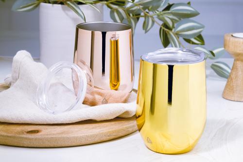 Double-wall, recycled stainless steel thermo cup with high gloss metallic finish and plastic drinking lid. 350 ml.