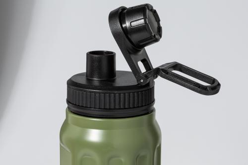 Double-wall, recycled stainless steel vacuum insulated bottle with vertical grooves. Features a PP drinking lid with integrated carry handle. 540 ml.