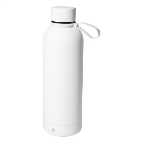 Double-wall, recycled stainless steel vacuum insulated bottle with rubberized finish and silicone carry handle, 500 ml.