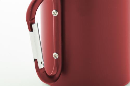 Double-wall, recycled stainless steel thermo mug with matching colour recycled aluminium carabiner handle. 300 ml. In kraft paper box.