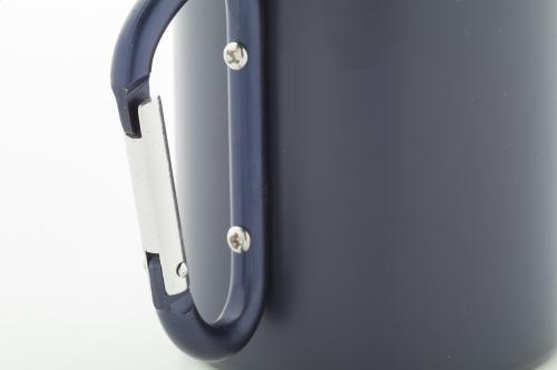 Double-wall, recycled stainless steel thermo mug with matching colour recycled aluminium carabiner handle. 300 ml. In kraft paper box.