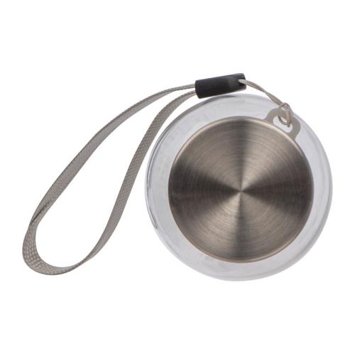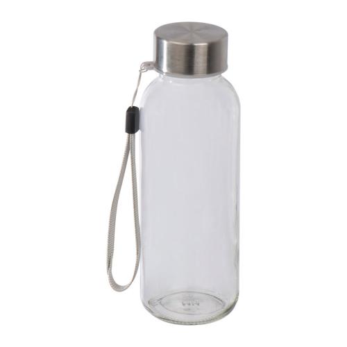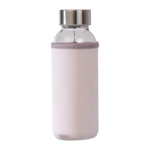 Transparent drinking bottle made of glass, with neoprene sleeve, closing lid, carrying strap, and 300 ml capacity.
