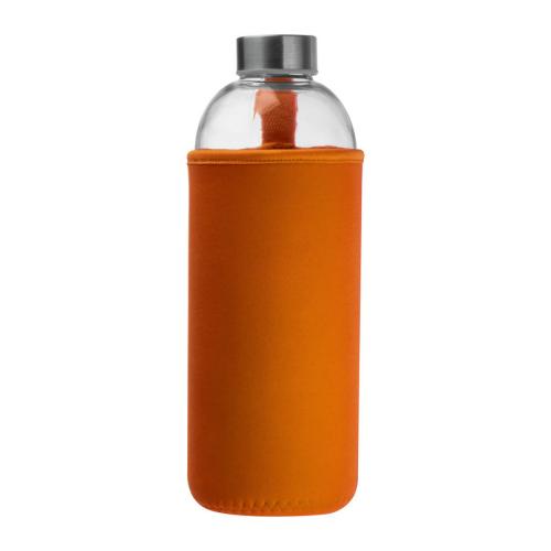 Leakproof drinking bottle, made out of glass, with neoprene sleeve, loop and a capacity of 1.000 ml.