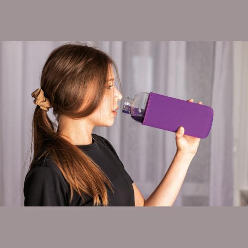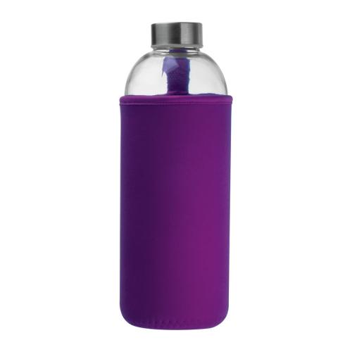 Leakproof drinking bottle, made out of glass, with neoprene sleeve, loop and a capacity of 1.000 ml.