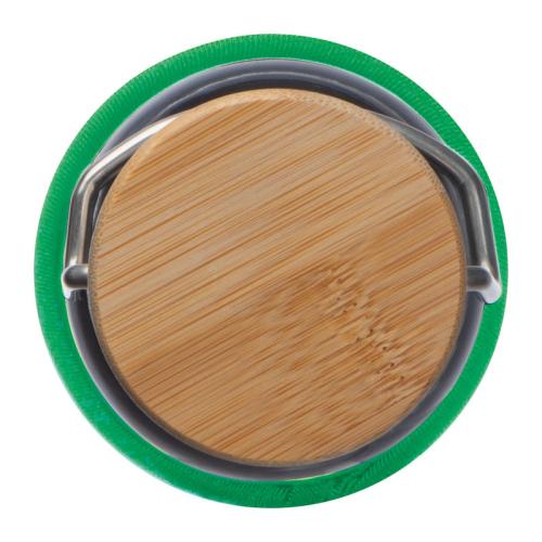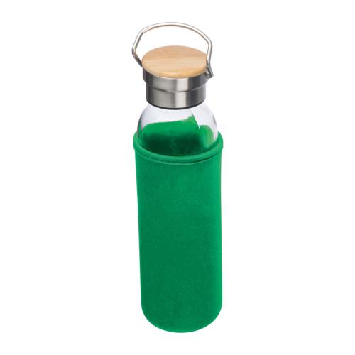 Glass drinking bottle with neoprene sleeve, stainless steel lid with bamboo top, carrying handle and a capacity of 600 ml.