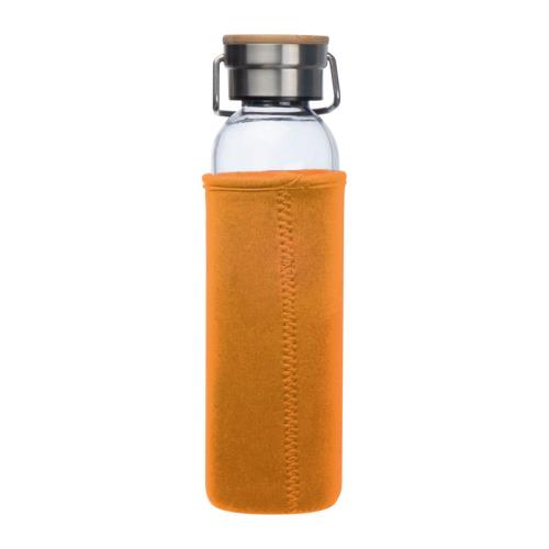 Glass drinking bottle with neoprene sleeve, stainless steel lid with bamboo top, carrying handle and a capacity of 600 ml.