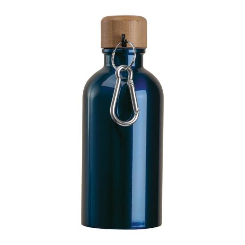 Small stainless steel drinking bottle with practical carabiner, a capacity of 400ml and a leak-proof screw cap with bamboo lid.
