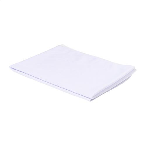 RPET polyester cooling sport towel in RPET sport bottle with PP flip-top drinking lid, integrated straw, and carry strap. 800 ml. BPA-free. Not suitable for carbonated drinks. Towel size: 30×80 cm.