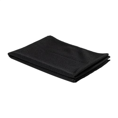 RPET polyester cooling sport towel in RPET sport bottle with PP flip-top drinking lid, integrated straw, and carry strap. 800 ml. BPA-free. Not suitable for carbonated drinks. Towel size: 30×80 cm.