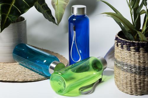 RPET bottle with stainless steel cap and carry strap, 500 ml. BPA-free. Not suitable for carbonated drinks.