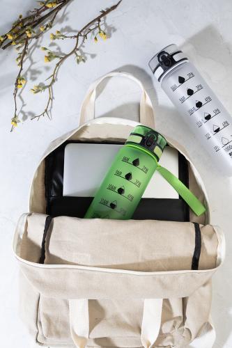 Frosted RPET sport bottle with motivational volume and time markings, featuring an auto-open flip-top drinking lid with safety lock and carry strap. 1000 ml. BPA-free. Not suitable for carbonated drinks.