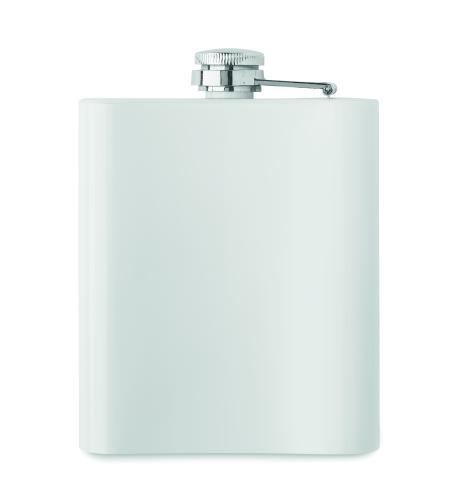 Slim hip flask in recycled stainless steel (90% recycled stainless and 10% stainless steel) with sublimation layer. Single wall. Capacity: 180 ml.