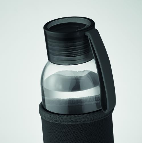Recycled glass bottle with neoprene pouch and PP lid with silicone hanger. Leak free. Capacity: 500 ml.