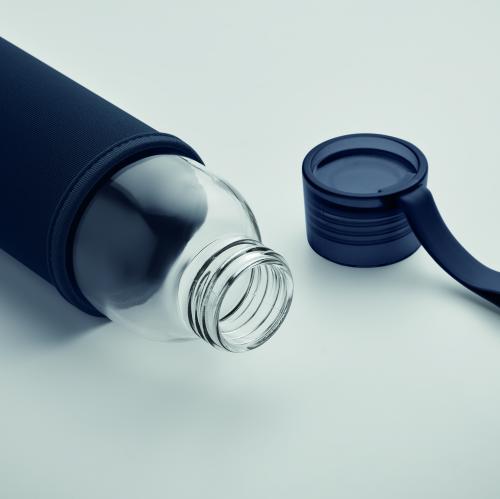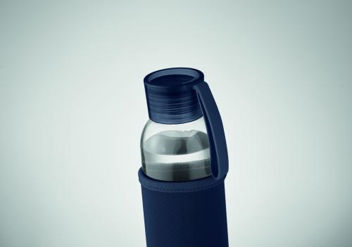 Recycled glass bottle with neoprene pouch and PP lid with silicone hanger. Leak free. Capacity: 500 ml.