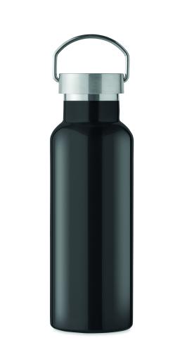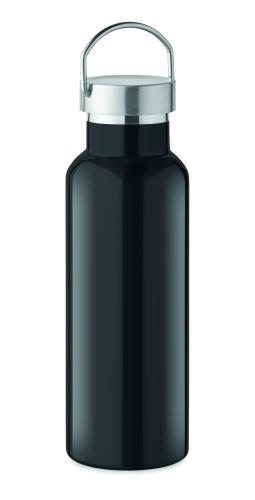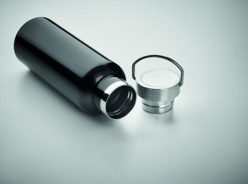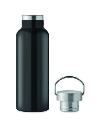 Double wall insulating vacuum bottle in recycled stainless steel (90 % recycled stainless steel and 10% stainless steel) with lid with handle. Capacity: 500 ml.