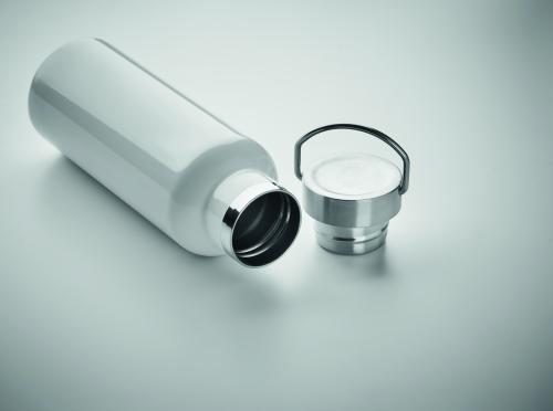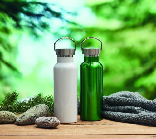 Double wall insulating vacuum bottle in recycled stainless steel (90 % recycled stainless steel and 10% stainless steel) with lid with handle. Capacity: 500 ml.