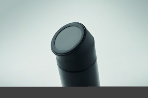 Double wall vacuum insulating bottle in recycled stainless steel (90% recycled stainless steel and 10% stainless steel) with silicone non-slip phone holder ring lid. Leak-free. Capacity: 420 ml.