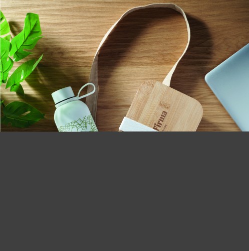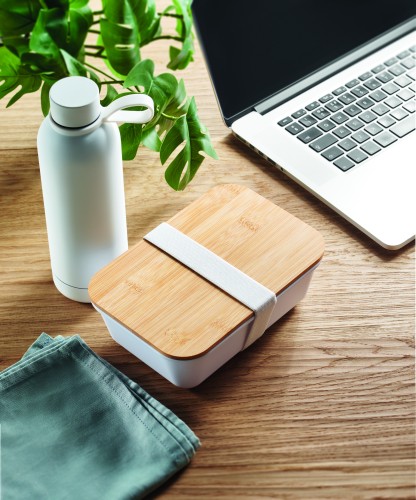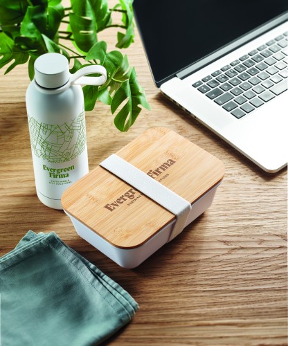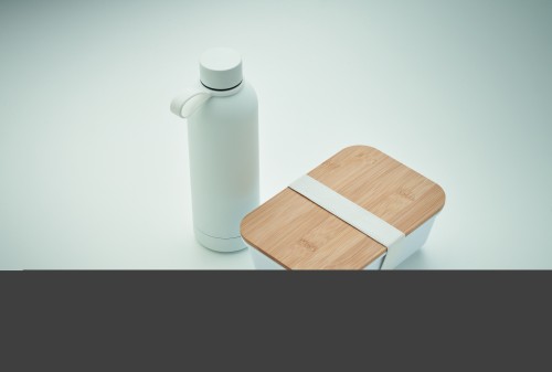 2 piece lunch gift set, including double wall vacuum insulating bottle in recycled stainless steel (90% recycled stainless steel and 10% stainless steel) and PP lunch box with bamboo lid and RPET elastic band. Leak-free. Capacity 500ml and 900ml.