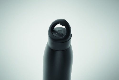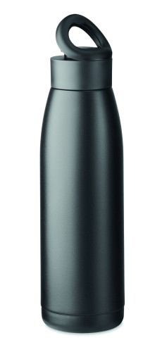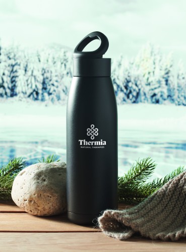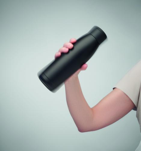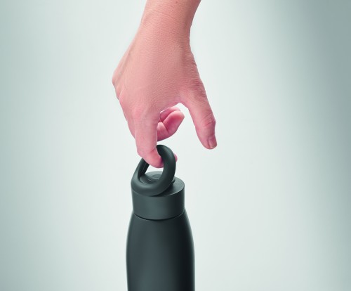 Double wall recycled stainless steel (90% recycled stainless steel and 10% stainless steel) bottle with soft silicone carry ring lid. By simply shaking the bottle surface temperature changes to heating or cooling, depends on liquid inside. Leak-free. Capacity: 400 ml.