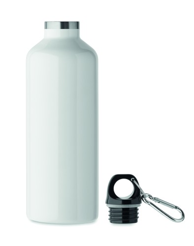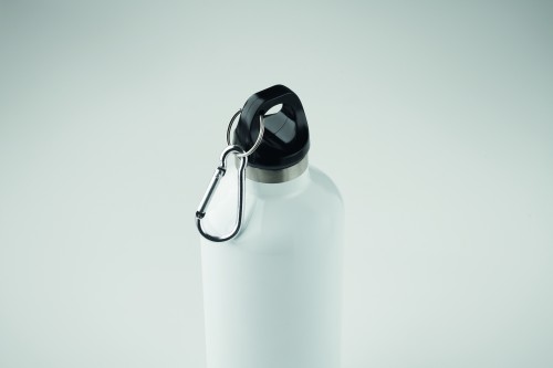 Double wall vacuum insulating bottle in recycled stainless steel (90% recycled stainless steel and 10% stainless steel) with carabiner handle lid. The carabiner is not for climbing (non-professional use). Leak-free. Capacity: 500 ml.