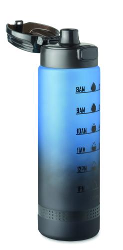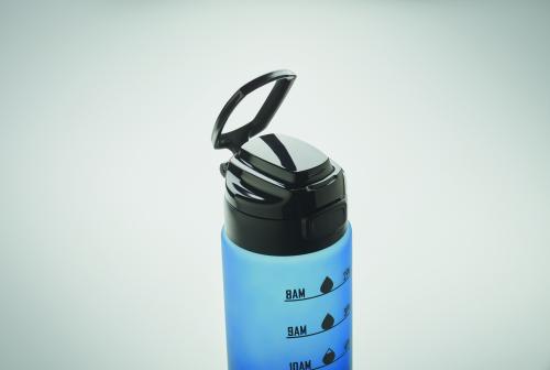 Sports water bottle in RPET, motivational time markings, one hand opening flip top lid, safety lock and carrying strap. Capacity: 1L.