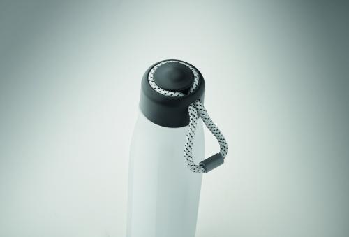 Double wall recycled stainless steel insulated vacuum bottle (90% recycled stainless steel and 10% stainless steel) with integrated cord grip on PP lid. Leak-free. Capacity: 500 ml.