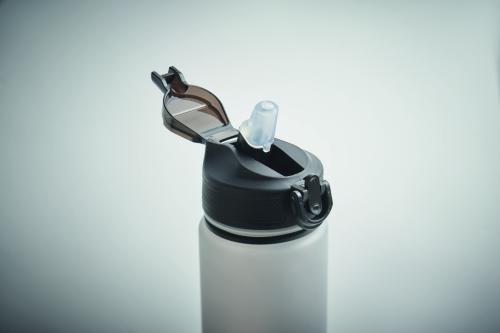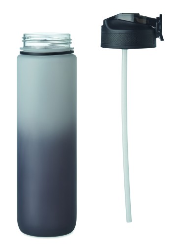 Sports water bottle in RPET with integrated straw, soft silicone mouth piece, motivational time markings, one hand opening flip top lid, safety lock and carrying strap. Capacity 1L.