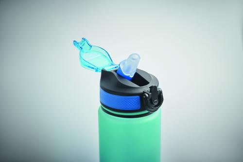 Sports water bottle in RPET with integrated straw, soft silicone mouth piece, motivational time markings, one hand opening flip top lid, safety lock and carrying strap. Capacity 1L.