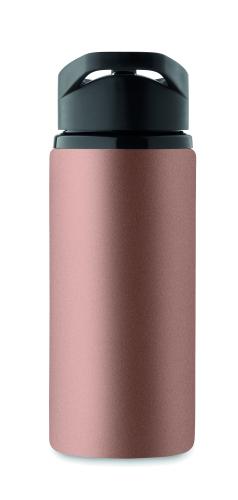 Recycled stainless steel (90% recycled stainless steel and 10% stainless steel) single wall bottle with foldable mouth piece, straw and lid with carrying handle. Capacity: 500 ml. As this is a single walled bottle, heat transfer can still occur.