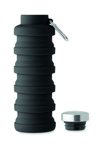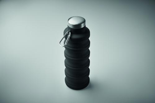 Collapsible silicone bottle with stainless steel lid and aluminium carabiner. The carabiner is not for climbing (non-professional use). Capacity: 500 ml.