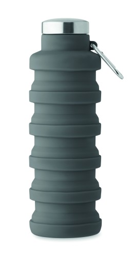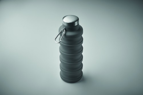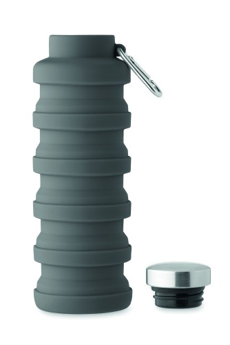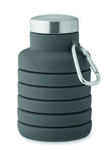 Collapsible silicone bottle with stainless steel lid and aluminium carabiner. The carabiner is not for climbing (non-professional use). Capacity: 500 ml.