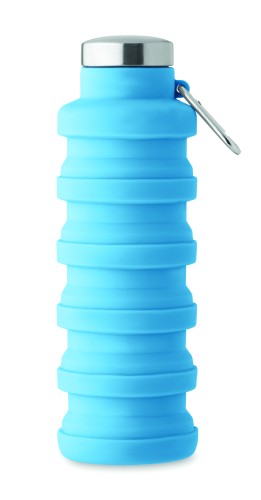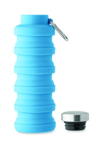 Collapsible silicone bottle with stainless steel lid and aluminium carabiner. The carabiner is not for climbing (non-professional use). Capacity: 500 ml.