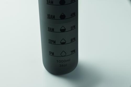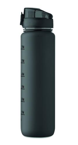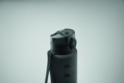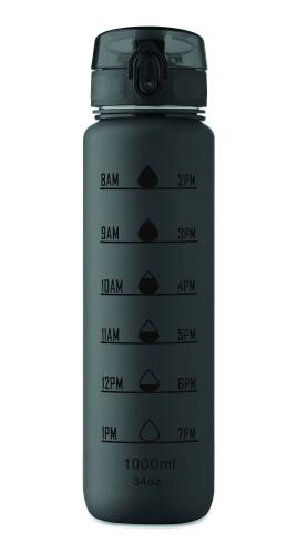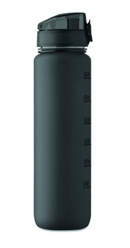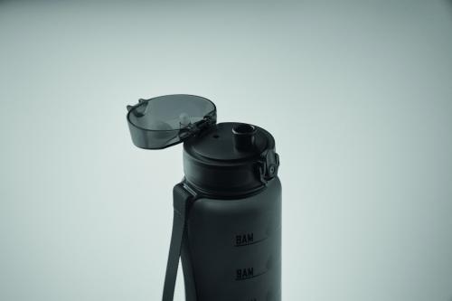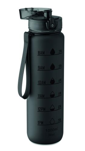 Sports water bottle in RPET, motivational time markings, one hand opening flip top lid, safety lock and carrying strap. Leak-free. Capacity: 1L.