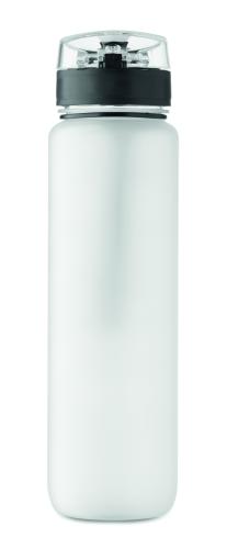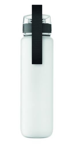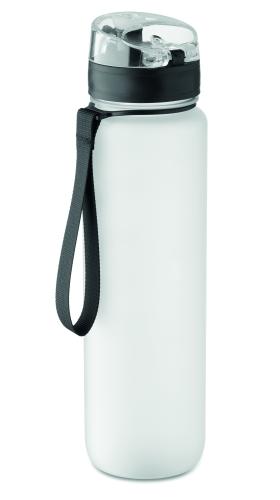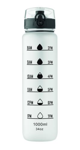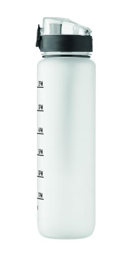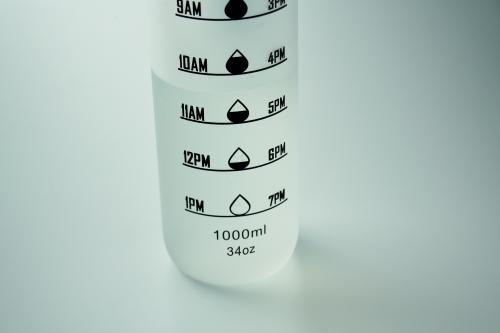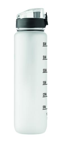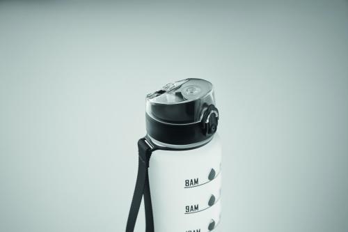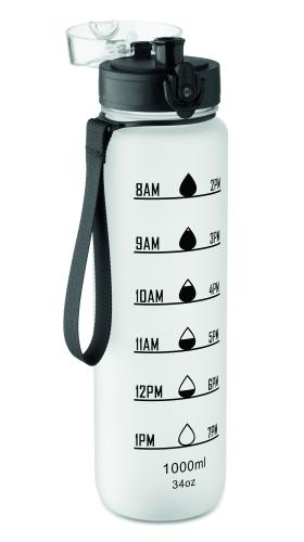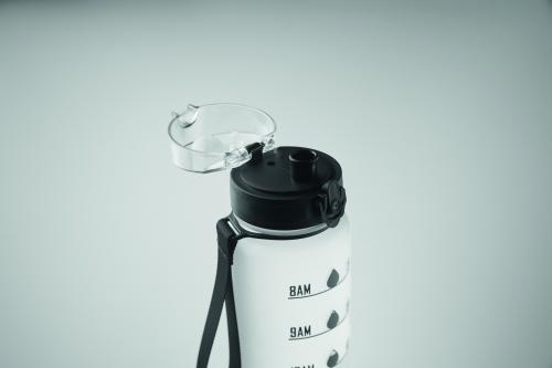 Sports water bottle in RPET, motivational time markings, one hand opening flip top lid, safety lock and carrying strap. Leak-free. Capacity: 1L.