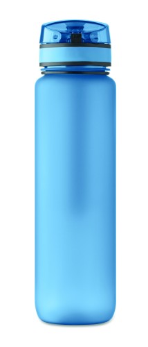 Sports water bottle in RPET, motivational time markings, one hand opening flip top lid, safety lock and carrying strap. Leak-free. Capacity: 1L.