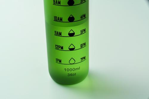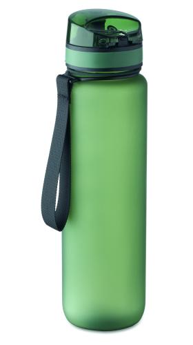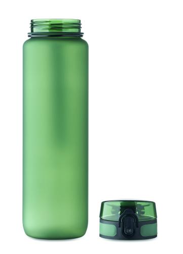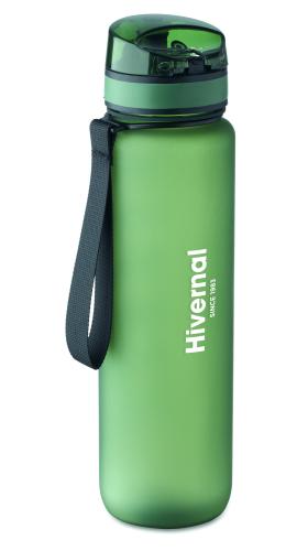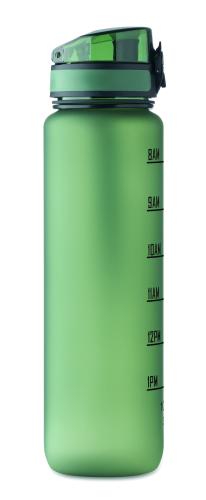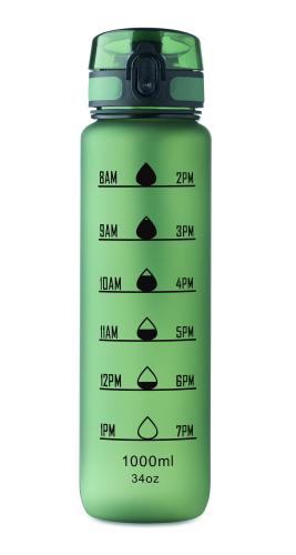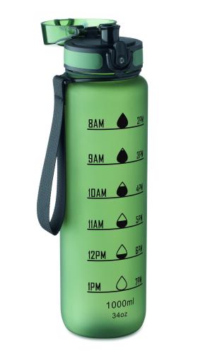 Sports water bottle in RPET, motivational time markings, one hand opening flip top lid, safety lock and carrying strap. Leak-free. Capacity: 1L.