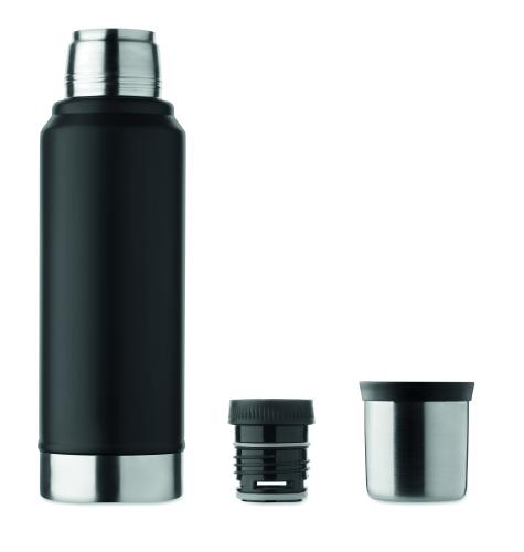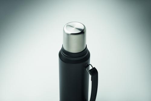 Double wall vacuum insulating bottle in recycled stainless steel (90% recycled stainless steel and 10% stainless steel) with handle on side. With PP lid and recycled stainless steel cup. Leak-free. Capacity: 1L.