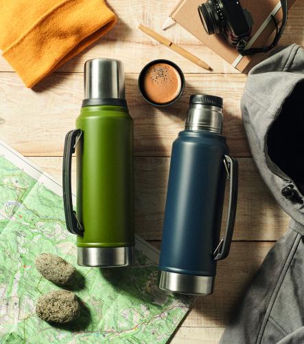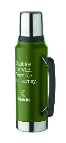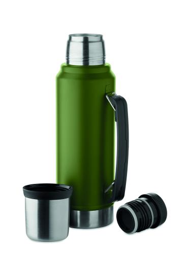 Double wall vacuum insulating bottle in recycled stainless steel (90% recycled stainless steel and 10% stainless steel) with handle on side. With PP lid and recycled stainless steel cup. Leak-free. Capacity: 1L.