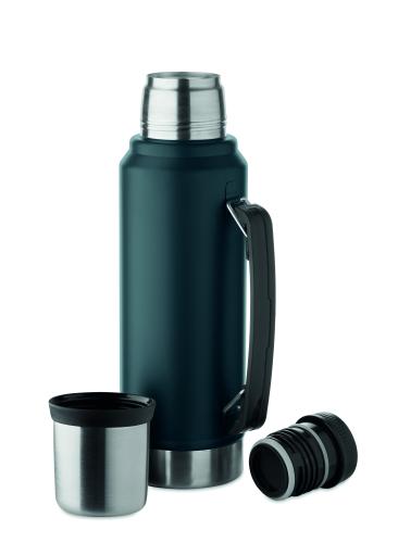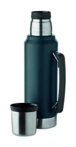 Double wall vacuum insulating bottle in recycled stainless steel (90% recycled stainless steel and 10% stainless steel) with handle on side. With PP lid and recycled stainless steel cup. Leak-free. Capacity: 1L.