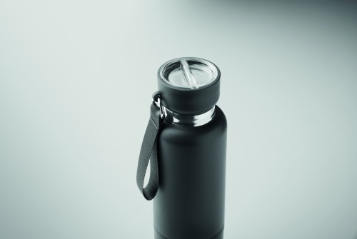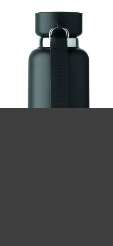 Double wall insulated bottle in 90% recycled stainless steel and 10% stainless steel, with integrated strap handle and additional long strap (70cm) in PP lid. Leak-free. Bottom cup included. Capacity: 500 ml.